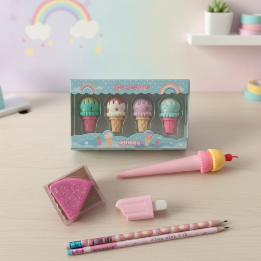 Para quem ama papelaria criativa e não resiste a um toque açucarado, o Kit Doce Papelaria é simplesmente irresistível! Cheio de itens com design inspirado em sobremesas, ele traz cor, diversão e praticidade para seu dia a dia.
